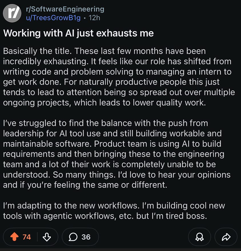 Developers saying they are already tired of working with AI for their projects. “It’s like managing some interns, instead of creating something fun.”